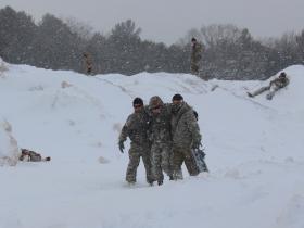 A mock bomb exploded while cadets were training in snowy conditions, as winds whipped across the intramural fields off Lincoln Avenue. Those who “suffered injuries” from the blast were transported across the street to the Armory gymnasium, where seniors in a medical surgical nursing course were waiting to help.