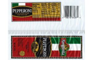 - 8-oz. plastic shrink-wrapped packages containing unsliced pepperoni “Margherita PEPPERONI” with lot code P1931C and a “use by date” of 12-14-21 represented on the label.